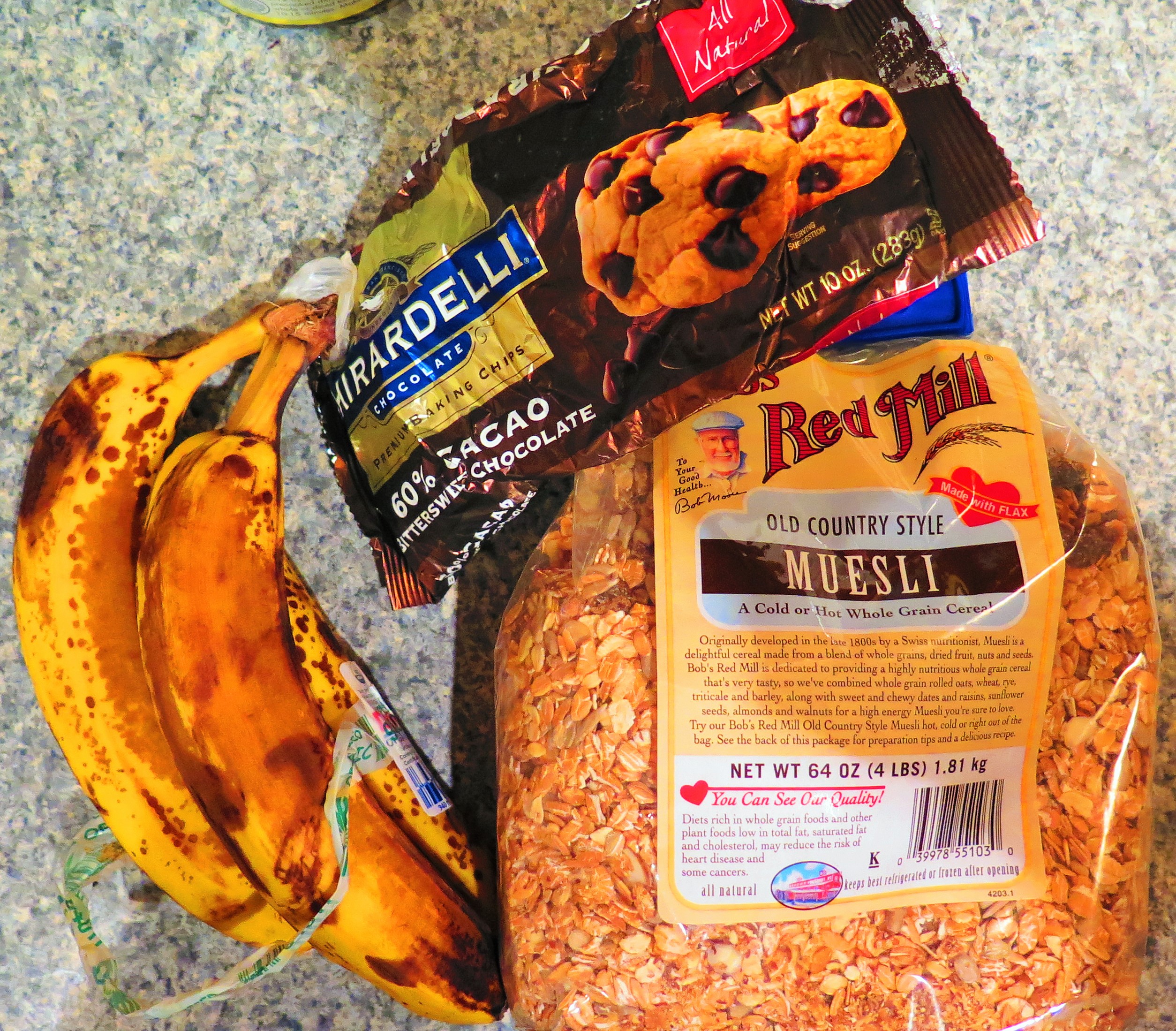 Add one-and-a-half cups of Bob’s Red Mill Muesli and a large handful or two of baking chocolate chips (I like bittersweet). Mix it up real good. Use your hands – I know I did. I have two of the best mixers attached to the end of my arms and I’m not afraid to use them.