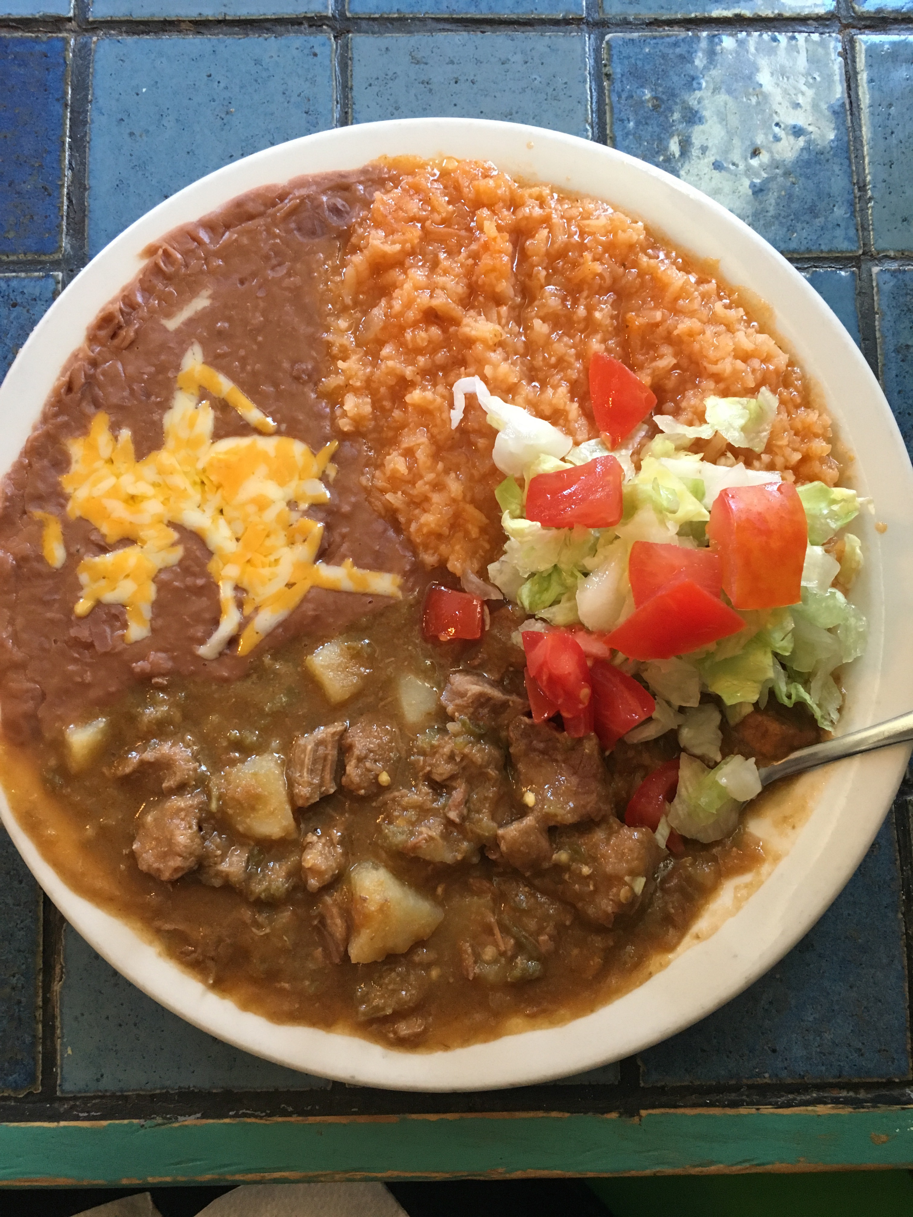 Update: Here are a couple pictures from our lunch yesterday… he had the Asado plate, and I had the Chile Verde plate. We figured out we can order one plate and a burrito and share everything because it was a LOT of food… every plate is served with a big flour tortilla and homemade French fries.