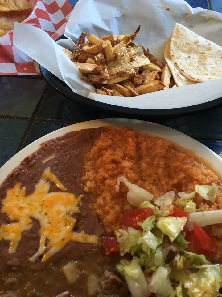 My husband ordered the Zo Burrito – chicken fajitas, cheese and grilled pico de gallo wrapped in a large flour tortilla. I ordered the Asado plate – shredded pork in red chile sauce served with beans, rice, a flour tortilla and homemade, fresh-cut French fries. I’d never before had a Mexican plate served that included French fries without having to order them separately.