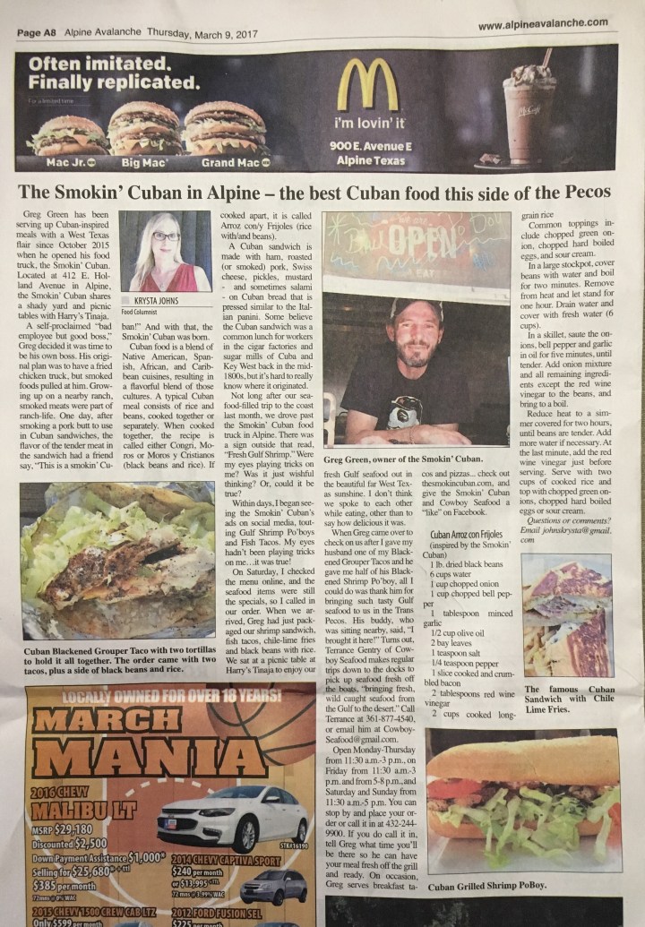 Open Monday-Friday, 11:30 a.m. – 3 p.m. and also 5-8 p.m. on Friday, Saturday and Sunday from 11:30 a.m.-5 p.m., you can stop by and place your order or call it in at (432)244-9900. If you do call it in, tell Greg what time you’ll be there so he can have your meal fresh off the grill and ready. On occasion, Greg serves breakfast tacos and pizzas… check out http://www.thesmokincuban.com and give The Smokin’ Cuban and Cowboy Seafood a “like” on Facebook.