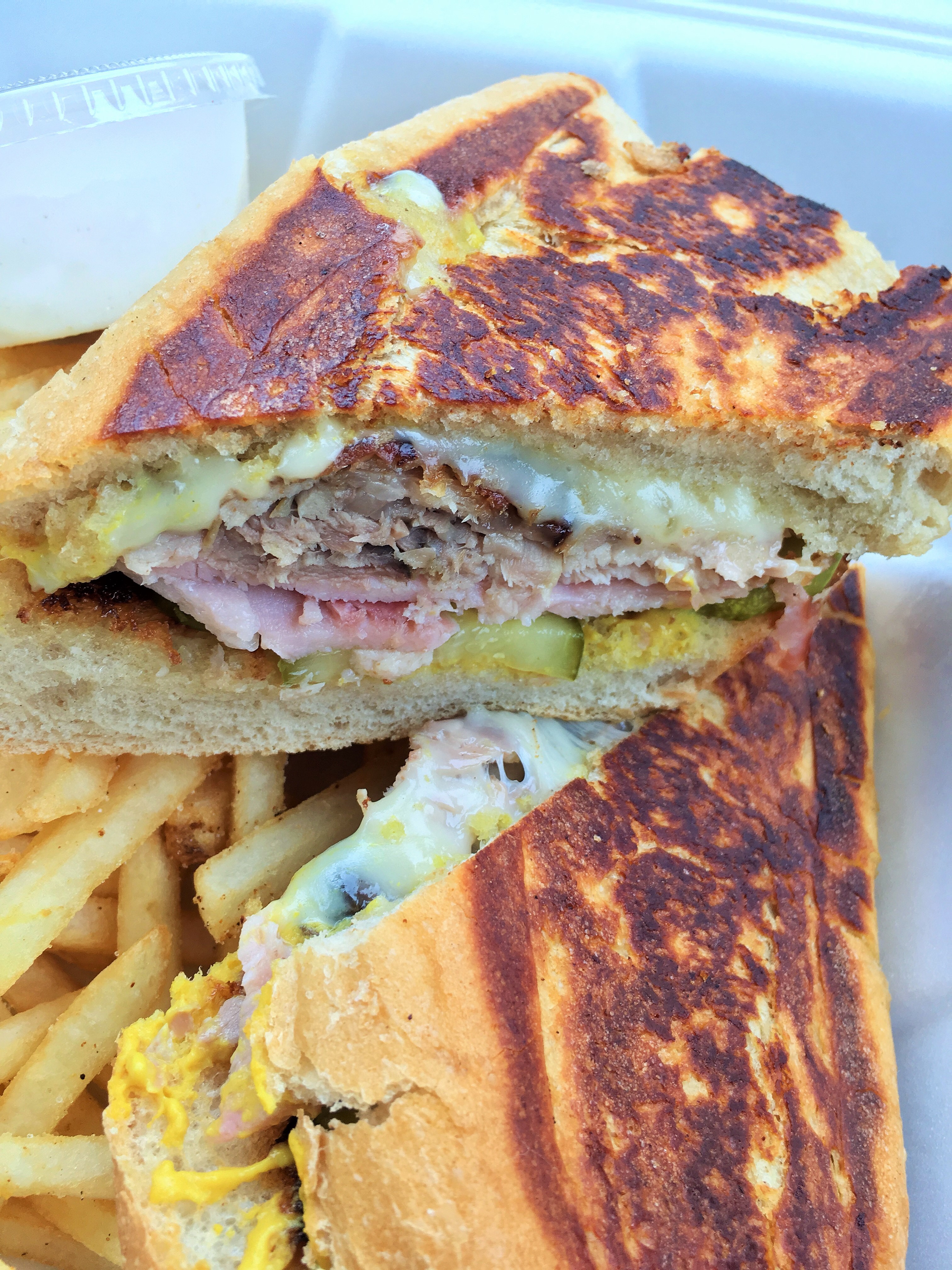 A Cuban sandwich is made with ham, roasted (or smoked) pork, Swiss cheese, pickles, mustard (and sometimes salami) on Cuban bread that is pressed similar to the Italian panini. Some believe the Cuban sandwich was a common lunch for workers in the cigar factories and sugar mills of Cuba and Key West back in the mid-1800s, but it’s hard to really know where it originated.