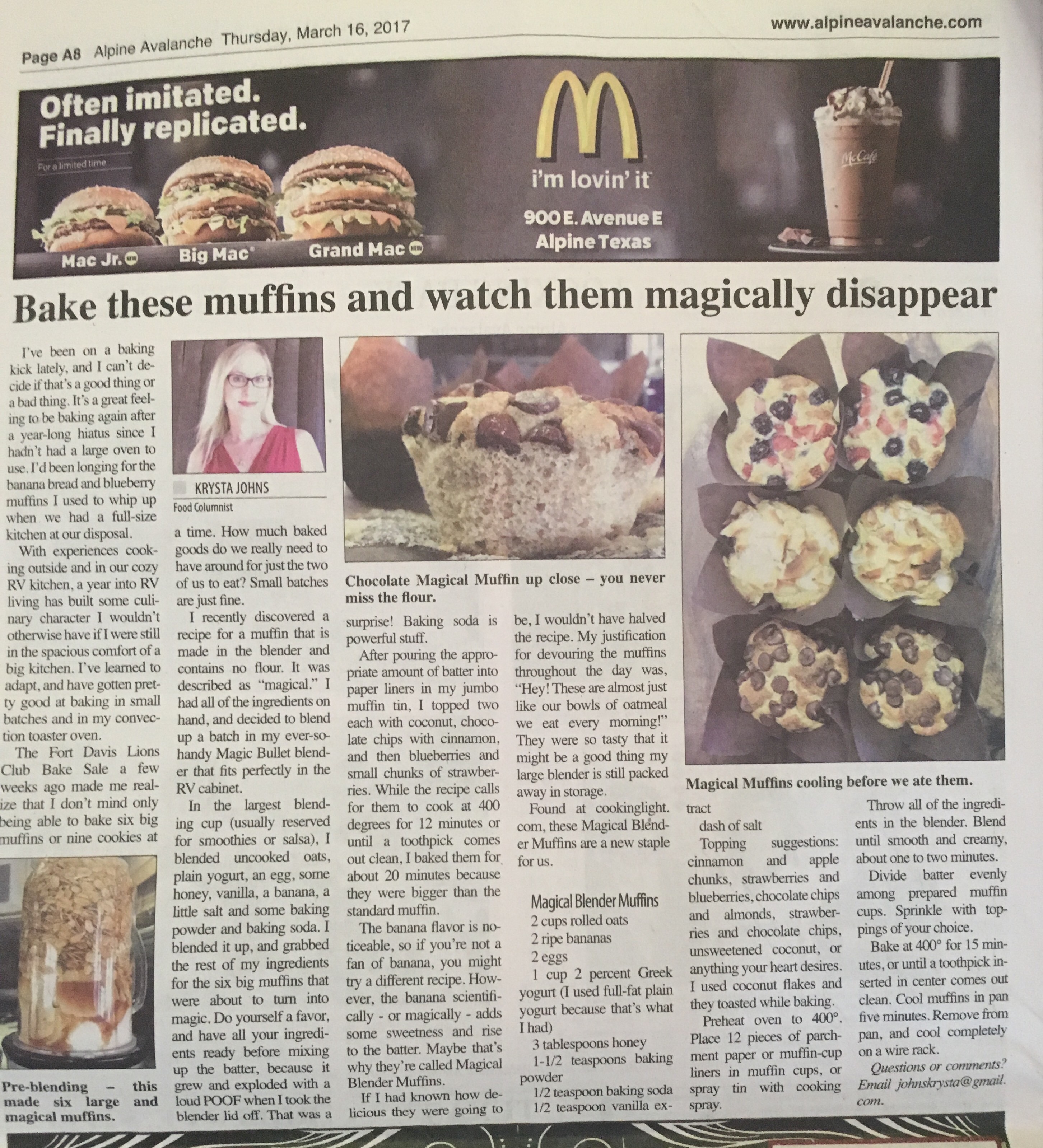 Found at www.cookinglight.com, these Magical Blender Muffins are a new staple for us. Email johnskrysta@gmail.com with questions or comments.