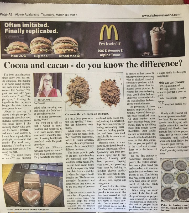 “Are you using cocoa or cacao?” my husband asked after savoring several pieces of a fresh batch of chocolate candies.