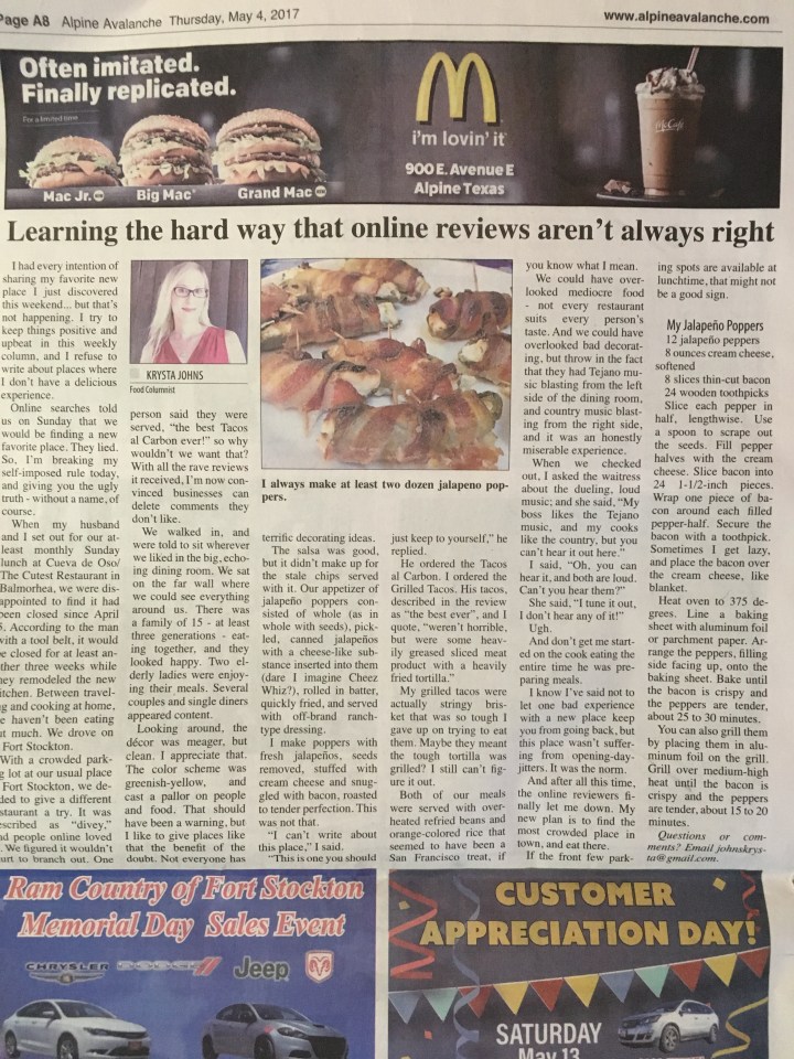 We figured it wouldn’t hurt to branch out. One person said they were served, “the best Tacos al Carbon ever!” so why wouldn’t we want that? With all the rave reviews they received, I’m now convinced businesses can delete comments they don’t like.