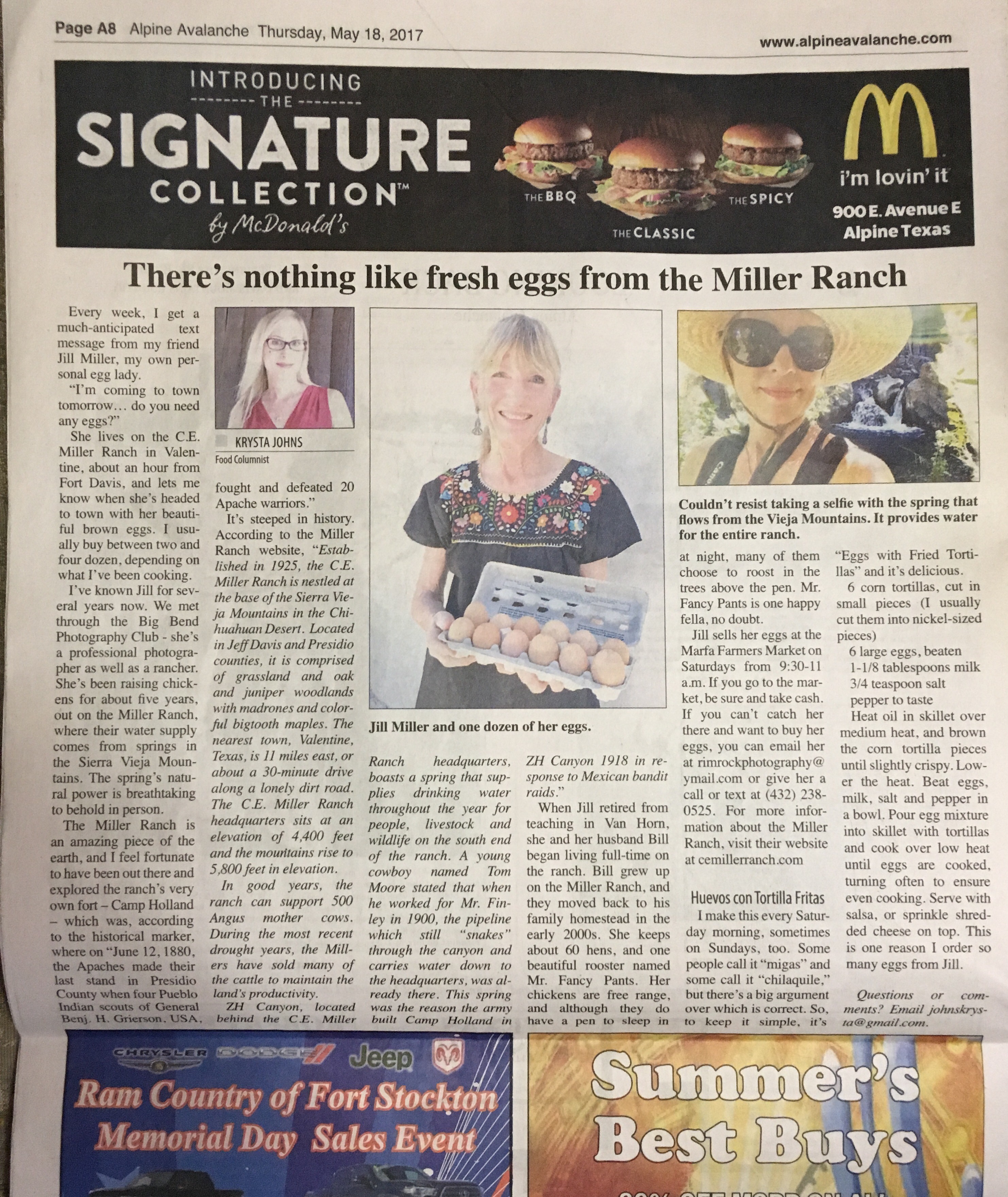 Jill sells her eggs at the Marfa Farmers Market on Saturdays from 9:30 a.m. to 11 a.m. If you go to the market, be sure and take cash. If you can’t catch her there and want to buy her eggs, you can email her at rimrockphotography@ymail.com. For more information about the Miller Ranch, visit their website at cemillerranch.com
