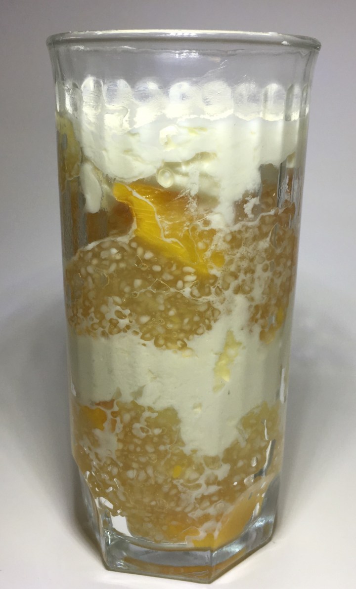 My sherbet glasses are in storage so I opted for a parfait-like serving, layering the sticky pudding with homemade whipped cream. I plan to make this again – and try different sizes of tapioca.