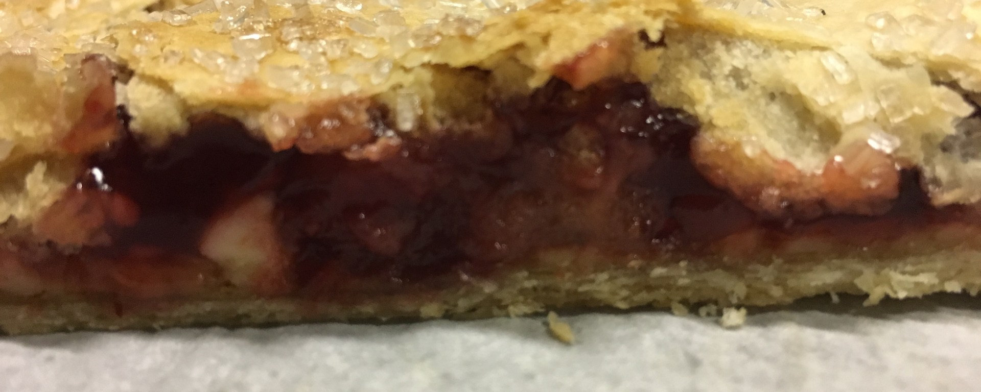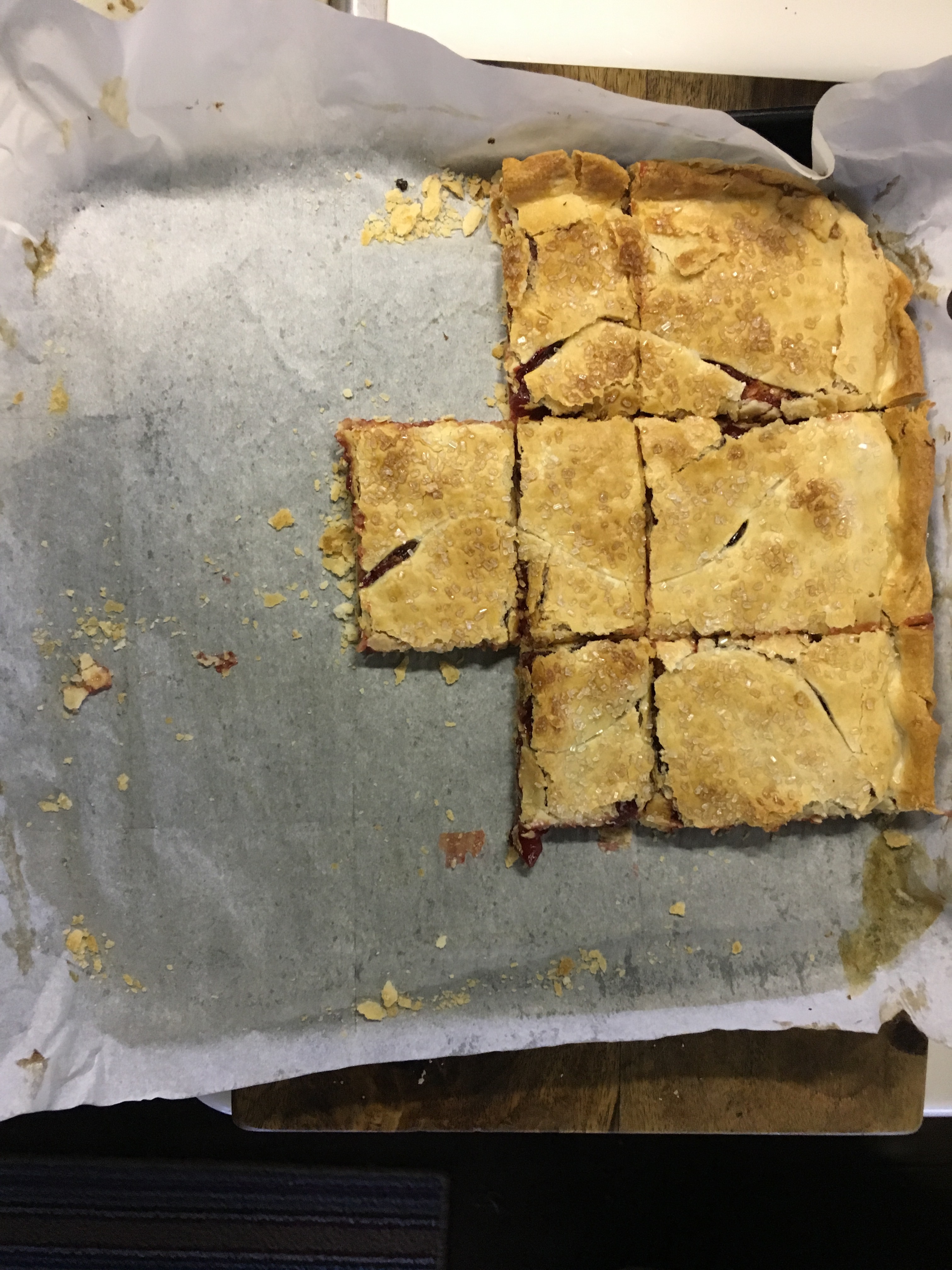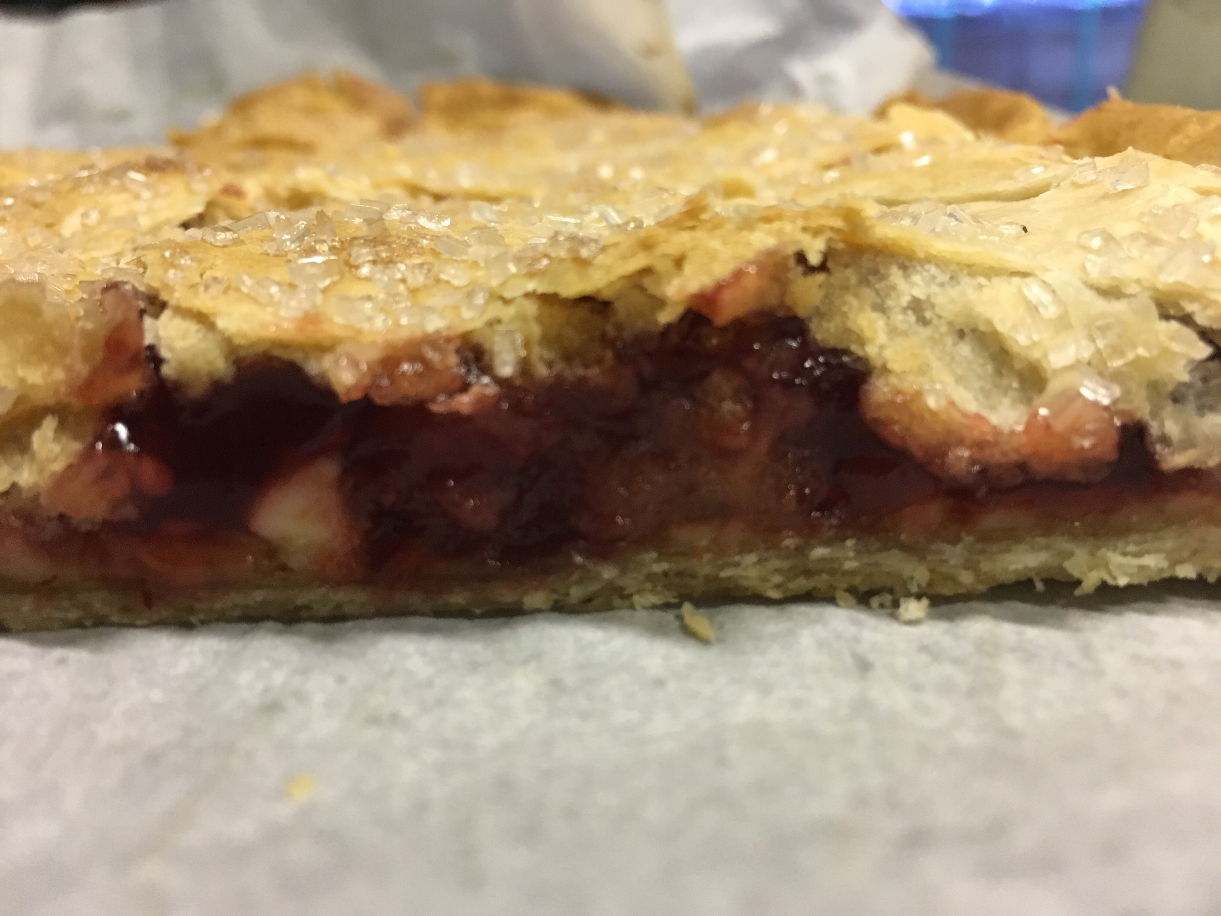 So, what is a slab pie? Slab pies are not your standard round pies. A slab pie is a pie that’s been baked in a rimmed pan like a jelly pan (or in my case, a 12×12 pan in the convection oven). There’s a higher crust to filling ratio than the round pie, and if you’re going to feed a crowd, this is the pie you want to make because you can cut it in at least twice as many pieces as a round pie… maybe even more. I got sixteen pieces out of my slab pies.