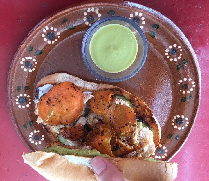 My torta was a huge, super soft roll filled with roasted chicken, avocado, sweet potato, pickles, mayo and a spicy jalapeño sauce for dipping. Both of our meals were fresh, flavorful and outstanding.