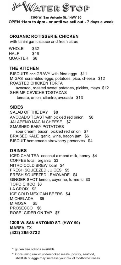 Don’t take the long drive through the dusty desert without a visit to The Water Stop. They’re open seven days a week, from 11 a.m.-4 p.m. Located at 1300 W. San Antonio in Marfa, call them at (432)295-3732. Give them a “like” on Facebook at The Water Stop.