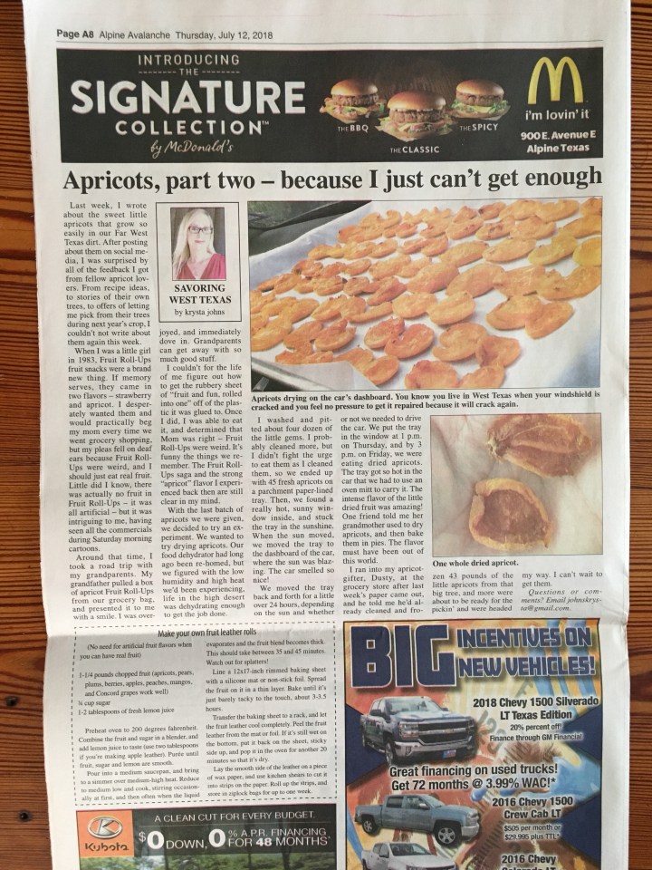 Last week, I wrote about the sweet little apricots that grow so easily in our Far West Texas dirt. After posting about them on social media, I was surprised with all of the feedback I got from fellow apricot lovers. From recipe ideas, to stories of their own trees, to offers of letting me pick from their trees during next year’s crop, I couldn’t not write about them again this week.