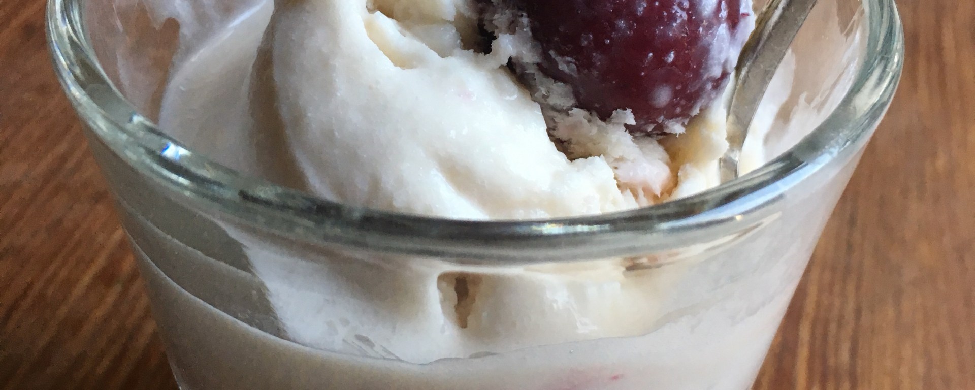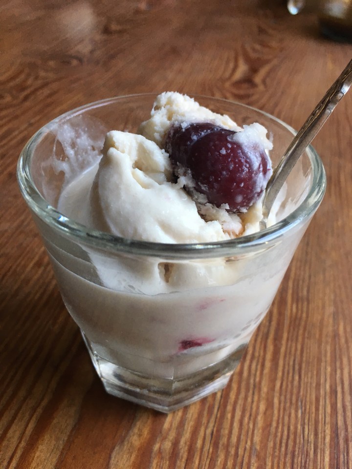 Cherry-almond-vanilla ice cream with no nuts that I made the other night… I made my own sweetened condensed milk using pure cane sugar and almond milk, and the almond flavor is very noticeable. It got two thumbs up.