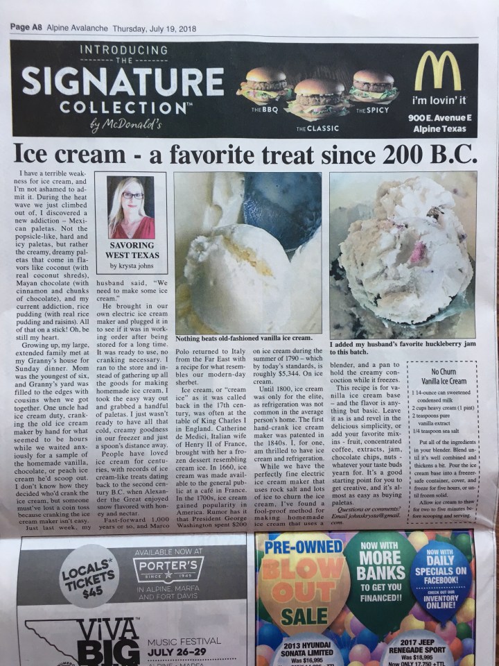 Growing up, my large extended family met at my Granny’s house for Sunday dinner. Mom was the youngest of six, and Granny’s yard was filled to the edges with cousins when we got together. One uncle had ice cream duty, cranking the old ice cream maker by hand for what seemed to be hours while we waited anxiously for a sample of the homemade vanilla, chocolate or peach ice cream he’d scoop out. I don’t know how they decided who’d crank the ice cream, but someone must’ve lost a coin toss because cranking the ice cream maker isn’t easy.