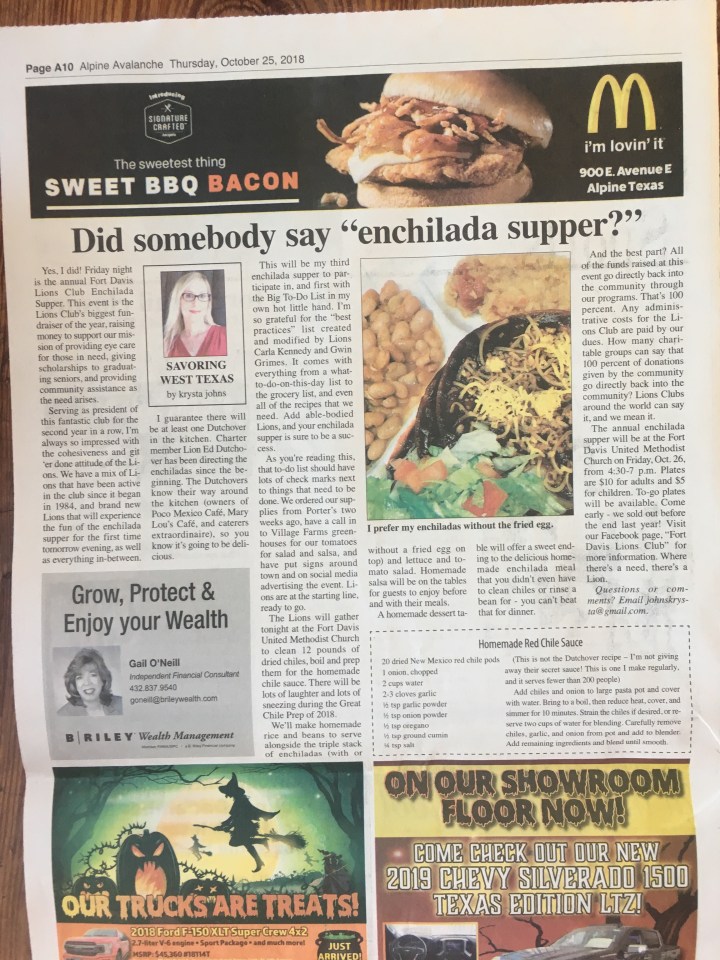 Tomorrow night is the annual Fort Davis Lions Club Enchilada Supper. This event is the Fort Davis Lions Club’s biggest fundraiser of the year, raising money to support our mission of providing eye care for those in need, giving scholarships to graduating seniors, and providing community assistance as the need arises.