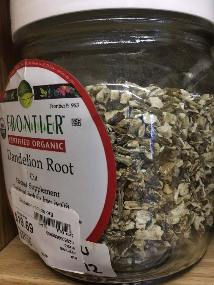 Get your organic dandelion root for tea at Blue Water Foods in Alpine!