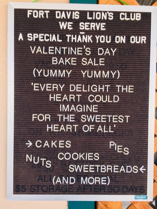 The Fort Davis Lions Club will have a Valentine’s Day Bake Sale next Thursday, on Valentine’s Day at Porter’s Thriftway across from the Fort Davis National Historic Site. We’ll be out there from 7 a.m. to about 11 a.m. with all sorts of homemade goodies for sale. That means I’ve got less than a week to get my baked goods in line and out of the oven.