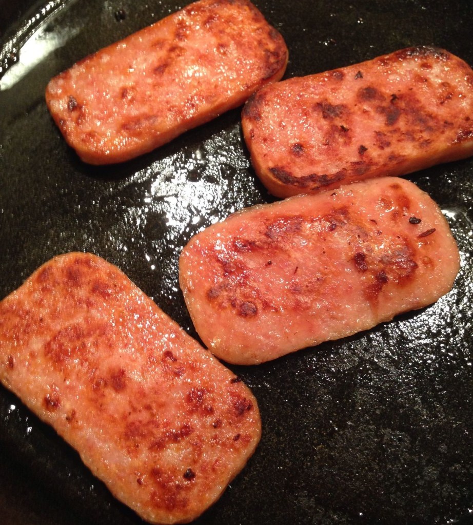 “Spamboaters” – take most of the bread out of a hotdog bun. Mix chopped Spam, chopped onion, chopped cheese and mayonnaise. Put in oven until cheese melts on top and bun is a little crispy.