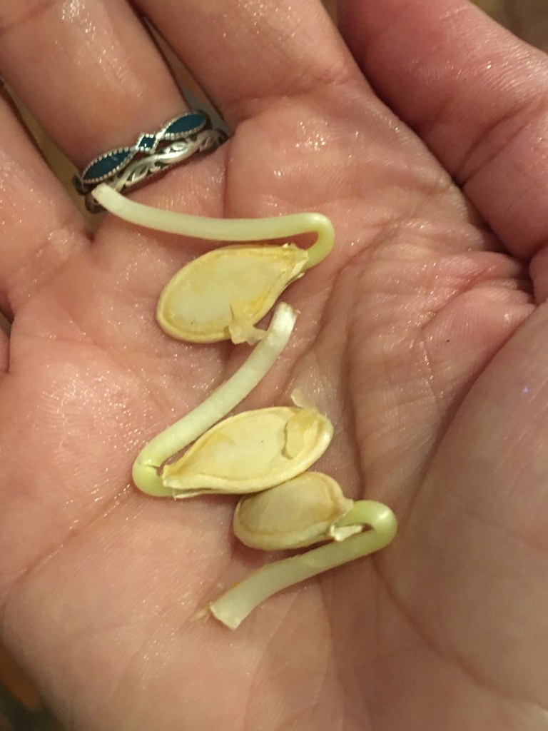 I brought home a spaghetti squash the other day, and when I cut it open to cook it, found that most of the seeds inside had started to sprout. It looks like we’ll be trying for a bumper crop of spaghetti squash this fall.