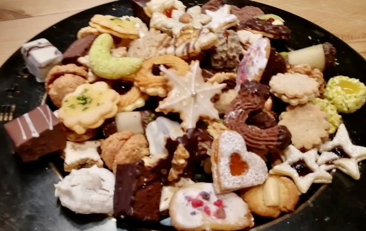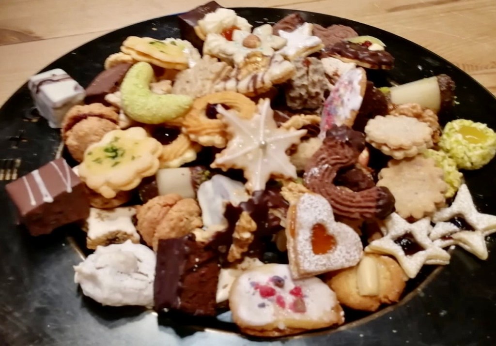 Another almost-instantaneous chime from my phone revealed a beautiful photo of a platter of Christmas cookies, homemade by my Bavarian friend Josef’s wife, Elfriede. Josef and I communicate regularly and I often have to translate his German text messages to English. Elfriede’s cookies are picture perfect, and almost too pretty to consider eating… but since she’s a talented baker, I’m pretty sure that plate of cookies was meant to be gobbled up.