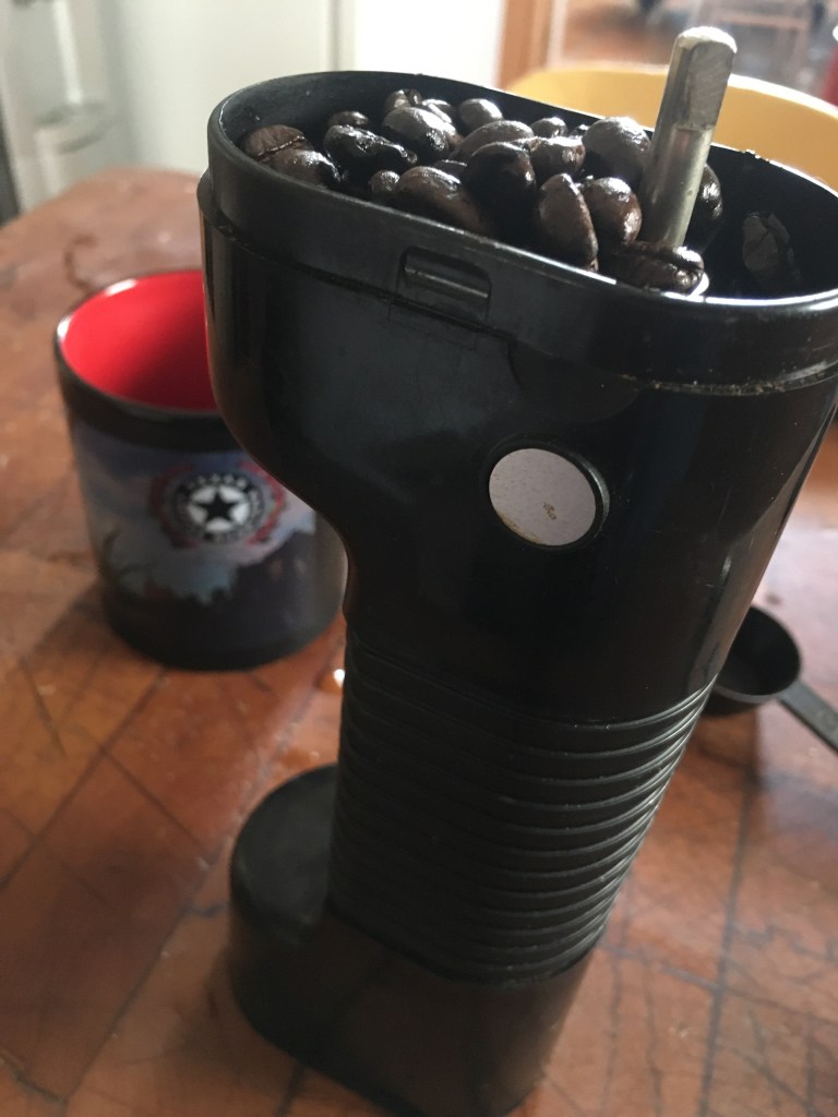 Luckily, I have a manual coffee grinder – one that you fill with beans and crank to grind – perfect for camping trips. Or for when you’ve got nothing but time on your hands and you’re looking to build up your biceps. Be sure and switch arms while you’re grinding the beans manually. It took every bit of 30 minutes to manually grind enough beans for four cups of coffee.