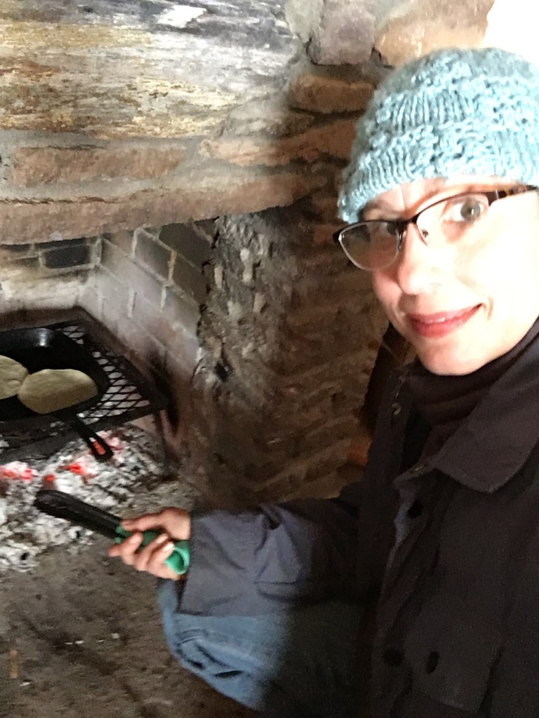 I cooked a big ol’ pot of breakfast oatmeal in a pot on the rocket stove (one cup oats, 2 cups water, pinch of salt, cover and cook – stir frequently until the water is absorbed), chopped wood and got the fireplace going. I have the cooking grate next to the fireplace, ready for the next meal I want to eat warm.